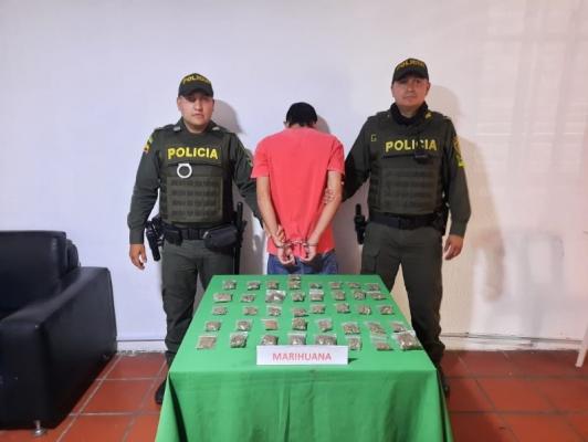 La acción policial se presentó en desarrollo de planes de vigilancia y control, llevados a cabo en la barrio Vélez, cuando observaron a un sujeto que se desplazaba por vía pública y el cual al notar la presencia policial toma una actitud sospechosa. De inmediato es abordado y le es practicado un registro a persona, hallándole en su mano derecha una bolsa plástica de color negro con 41 dosis de marihuana.