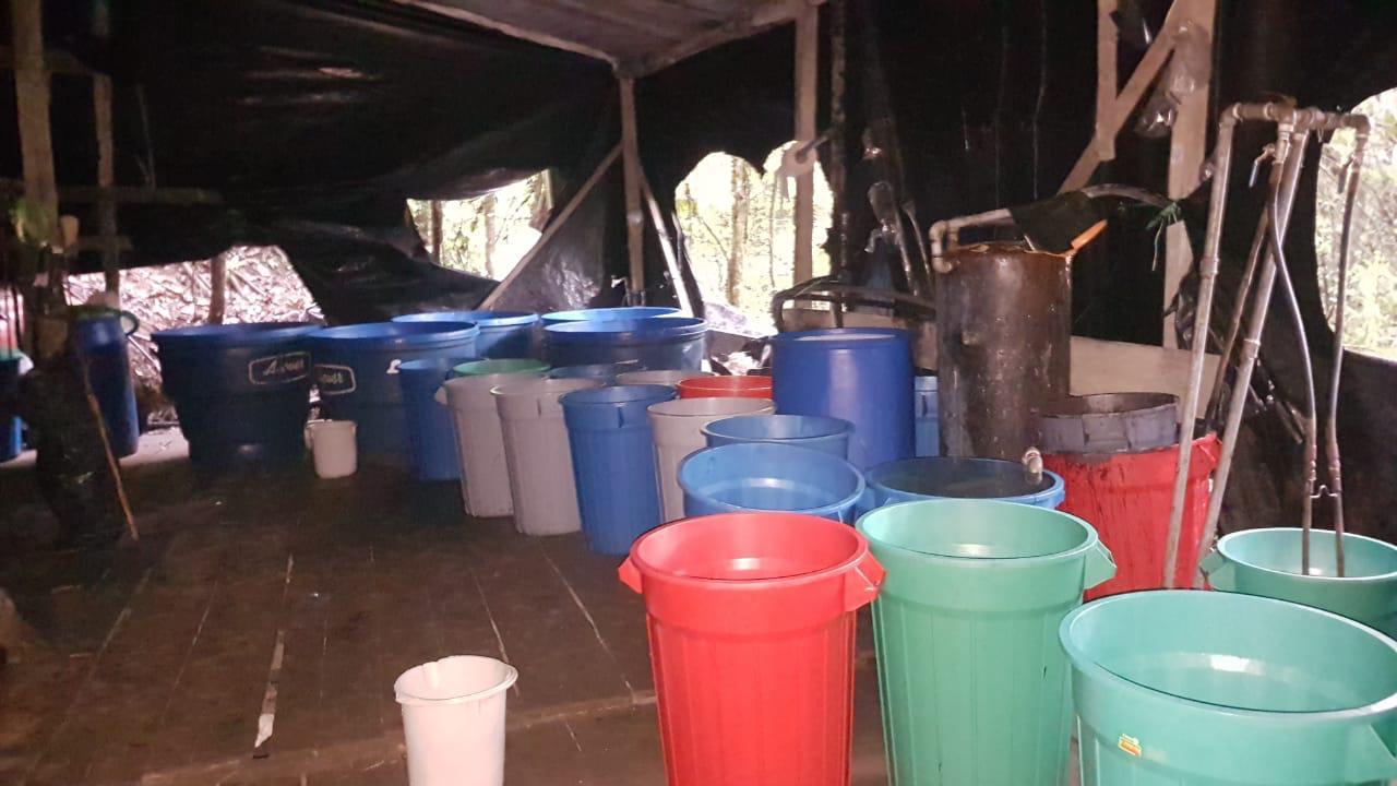 4.922 galones de insumos líquidos, 435 kilogramos de insumos sólidos, 392 kilogramos de base de cocaína, 5 pesas tipo reloj, 3 picadoras y 1 motobomba.