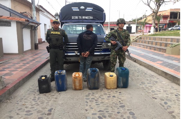 En la vereda Toledito, también se dieron resultados, pues el personal de la Estación de Policía del municipio de Toledo, en coordinación con Ejército Nacional, capturaron en flagrancia una persona de nacionalidad venezolana en momentos en que transportaba 35 galones de gasolina en una camioneta de color azul, material que sería comercializado en los municipios aledaños a Toledo.