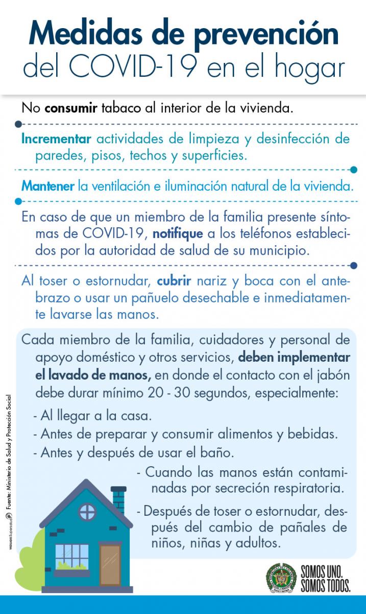 La Dirección de Sanidad de la Policía Nacional, atendiendo las orientaciones del Ministerio de Salud y Protección Social, le invita a seguir estas recomendaciones para prevenir la enfermedad respiratoria aguda por COVID-19 en su hogar.