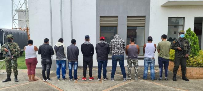 En el sector de Puente Remolino, municipio El Rosario, fueron capturadas diez personas quienes se movilizaban en cinco vehículos tipo campero y una camioneta, trasladando en su interior tanques de gran almacenamiento de líquidos y bidones plásticos de cinco galones que contenían combustible.