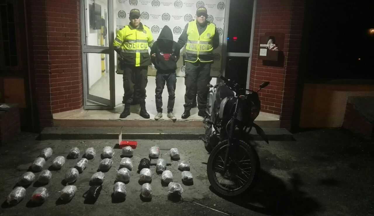 El procedimiento policial se llevó a cabo en el sector el higuerón de la vereda la unión, lugar en donde efectivos policiales en desarrollo de planes de patrullaje, detienen a un hombre que se movilizaba en una motocicleta color negra tipo sport, proceden a realizarle el respectivo registro personal y a sus pertenencias, hallándole al interior de una estopa blanca que tenía amarrada en la parrilla de la motocicleta, 30 paquetes encintados que contenían 15 kilogramos de marihuana tipo Cripy.